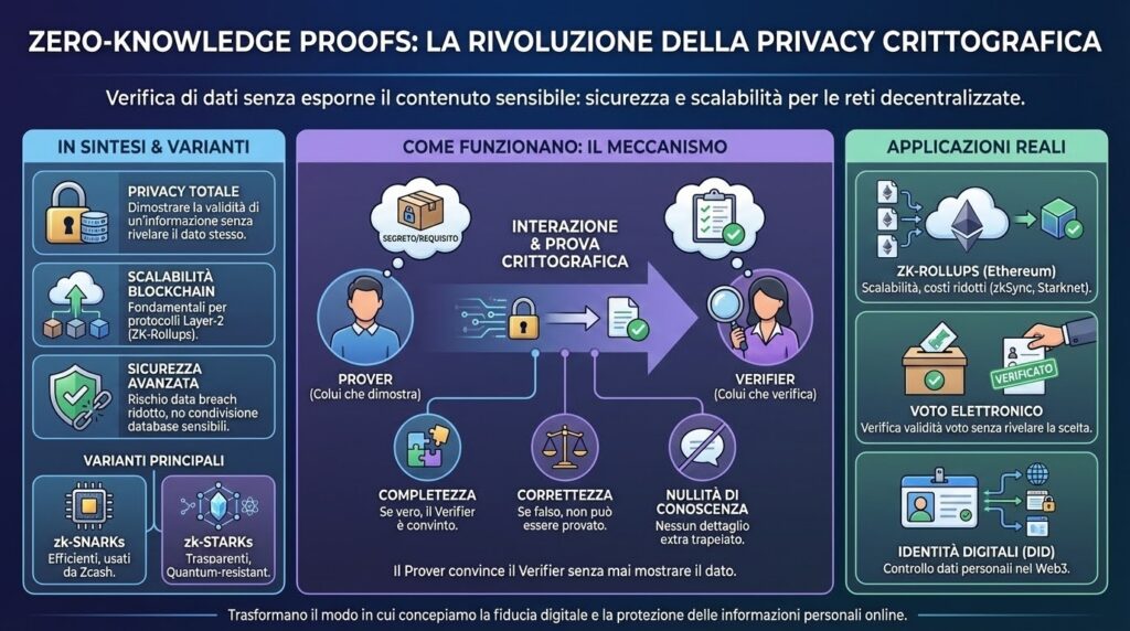 Le Zero-Knowledge Proofs rappresentano oggi il pilastro fondamentale per la sicurezza e la scalabilità delle reti decentralizzate, permettendo la verifica di dati senza esporne il contenuto sensibile. Questa tecnologia crittografica, nata negli anni ’80 ma esplosa con l’avvento della blockchain, sta trasformando il modo in cui concepiamo la fiducia digitale e la protezione delle informazioni personali online.