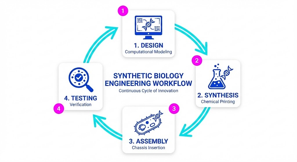 - Synthesis (Sintesi): Il DNA progettato non viene estratto dalla natura, ma stampato chimicamente (sintesi del DNA) in laboratorio.