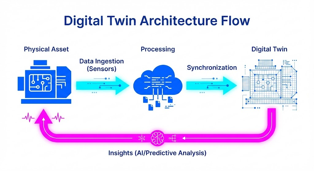 Per funzionare correttamente, questa tecnologia richiede un’architettura robusta basata su cloud computing (come Microsoft Azure Digital Twins o AWS IoT TwinMaker). Il flusso operativo segue uno schema preciso: