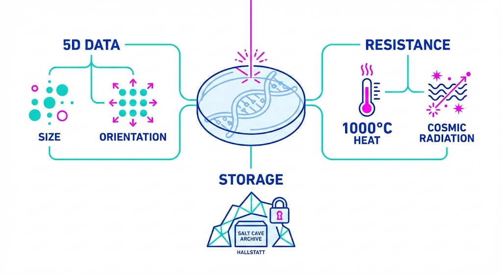 La tecnologia laser 5D ha raggiunto un traguardo storico permettendo all’Università di Southampton di archiviare l’intero genoma umano su un cristallo di memoria praticamente indistruttibile. Sviluppata dai ricercatori dell’Optoelectronics Research Centre (ORC), questa innovazione promette di conservare il codice della vita umana per miliardi di anni, sopravvivendo potenzialmente alla nostra stessa specie. Utilizzando laser ultraveloci per incidere dati nel vetro di silice, il team guidato dal Professor Peter Kazansky ha creato quello che è stato soprannominato il “cristallo di memoria di Superman”.