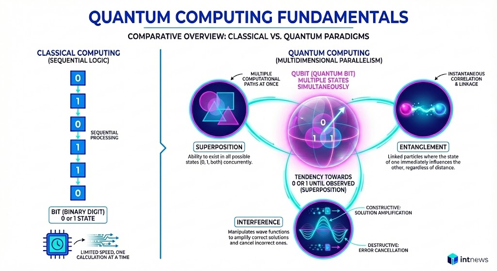 Il computer quantistico utilizza invece i Qubit (Quantum Bit). Grazie a un principio della fisica quantistica, un qubit può esistere in uno stato di 0, 1, o in una “sovrapposizione” di entrambi gli stati simultaneamente. Questo permette alla macchina di eseguire un numero massiccio di calcoli in parallelo, non più sequenzialmente. Come definito dal NIST e da IBM Research, questa capacità consente di gestire spazi computazionali che crescono esponenzialmente con l’aggiunta di ogni nuovo qubit.